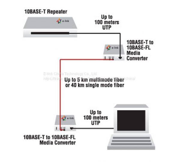 The E-link 10Base-FL/10Base-T Media Converter permits the repeaterless connection of twisted pair cable (10Base-T) and optical fiber (10Base-FL) in an Ethernet network. The converter is compatible with IEEE 802.3.