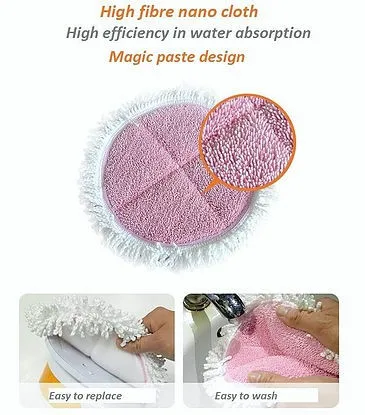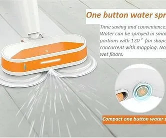 Spray water with a portion of 120 degree fan shape concurrent, clean the floor by high fibre nano cloth under the high-frequency rotating pad. No water residual at all.