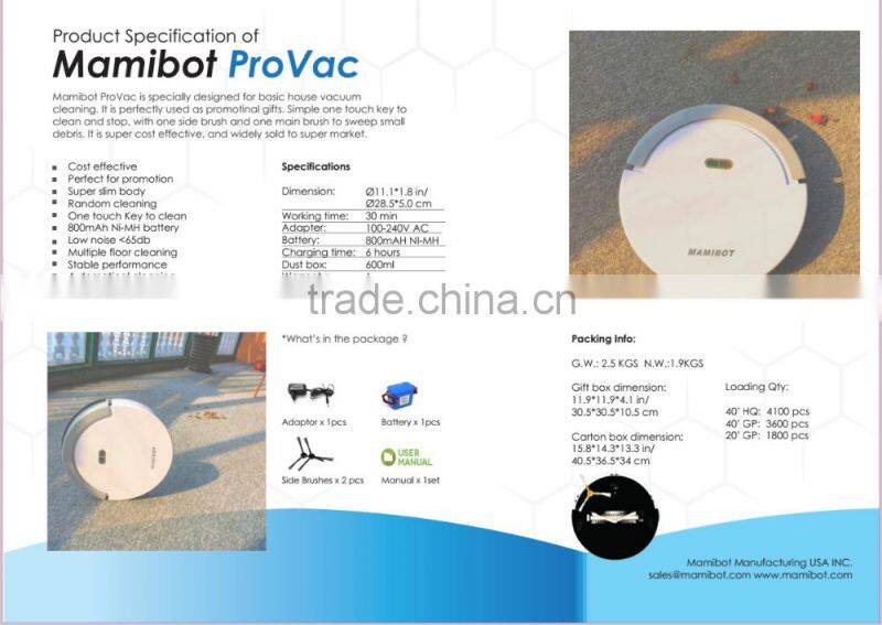 Mamibot Provac is specially designed for basic house vacuum cleaning, It is perfectly used as promotional gifts, Simple one touch key to clean ansd stop, with one side brush and one main brush to sweep small debris. It is super cost effective and widely sold to super market.