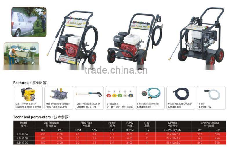 5.5HP 150BAR 2200PSI 9.2LPM 2.4GPM 168F car wash machine