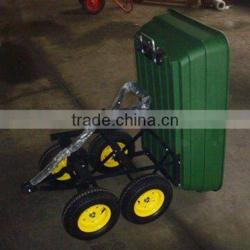 This Poly dumping Cart Made by Qingdao Weihao Industry Co.,Ltd which is perfect for lawn and landscaping projects, as well as work around the garden. Simple, balanced dumping minimizes strain, and the patented 2-in-1 handle quickly converts to allow the cart to be pulled by hand or behind a lawn tractor. The durable, molded bed won't rust, cleans easily, and is virtually maintenance-free, and the 5.00-6 pneumatic tires are designed for any terrain.