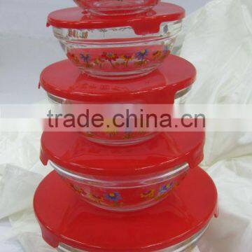 Glass bowl set with flower printed & nice plastic lid, it's good for promotion gift and kitchen glassware.