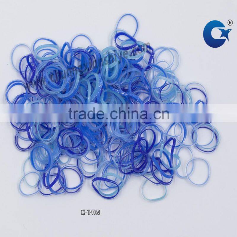 We ordinarily make the rubber bands in transparent white with glitter plus all kinds of blue, and we also can make any color in pantone color card.