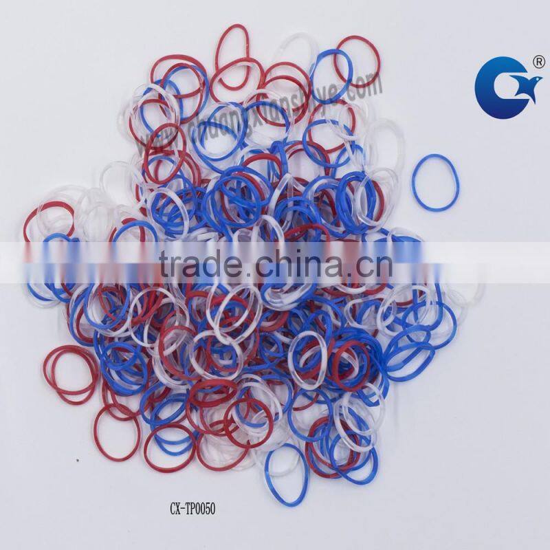 We ordinarily make the rubber bands in transparent+white, navy blue+transparent blue, red+transparent red, and we also can make any color in pantone color card.