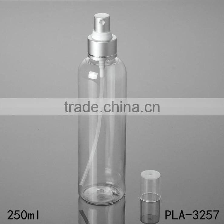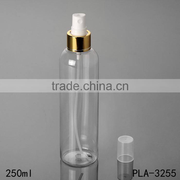 hot products round shoulder gold aluminum spray pet plastic bottle 250ml cosmetic perfume toner water clear pet bottle wholesale