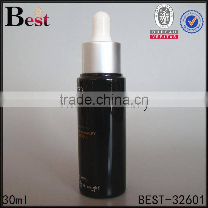 alibaba china cosmetic screen printing logo 30ml black glass bottle matte silver aluminum dropper for perfume essential oil