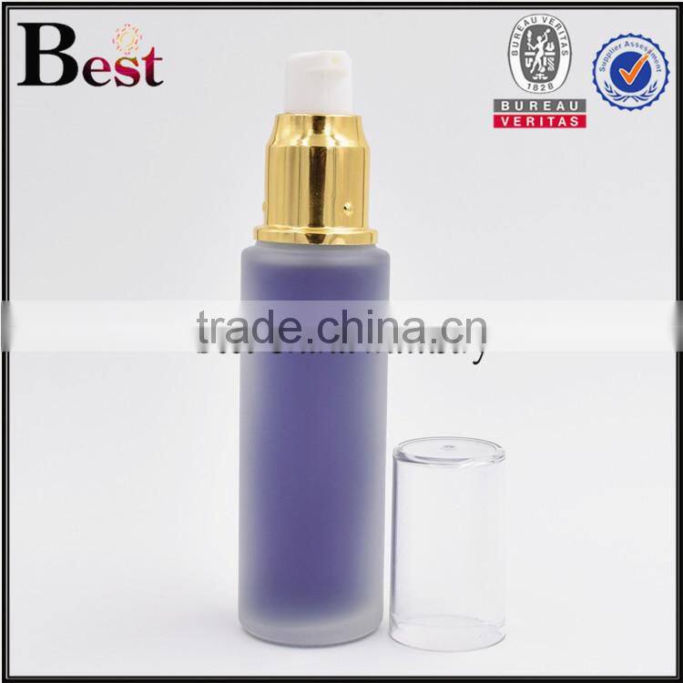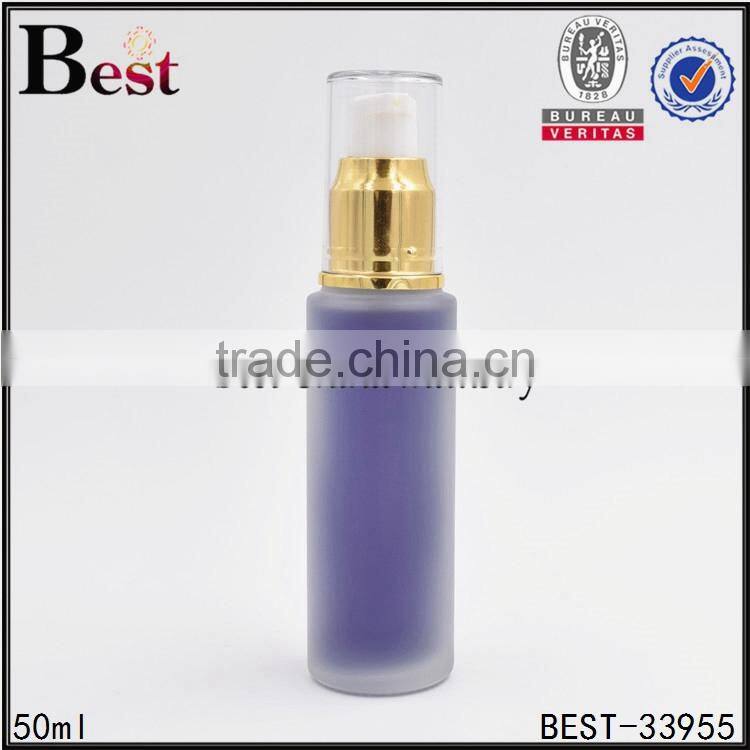 50ml high grade alibaba china empty frosted glass bottle with gold aluminum pump pet cover for lotion cosmetic packaging