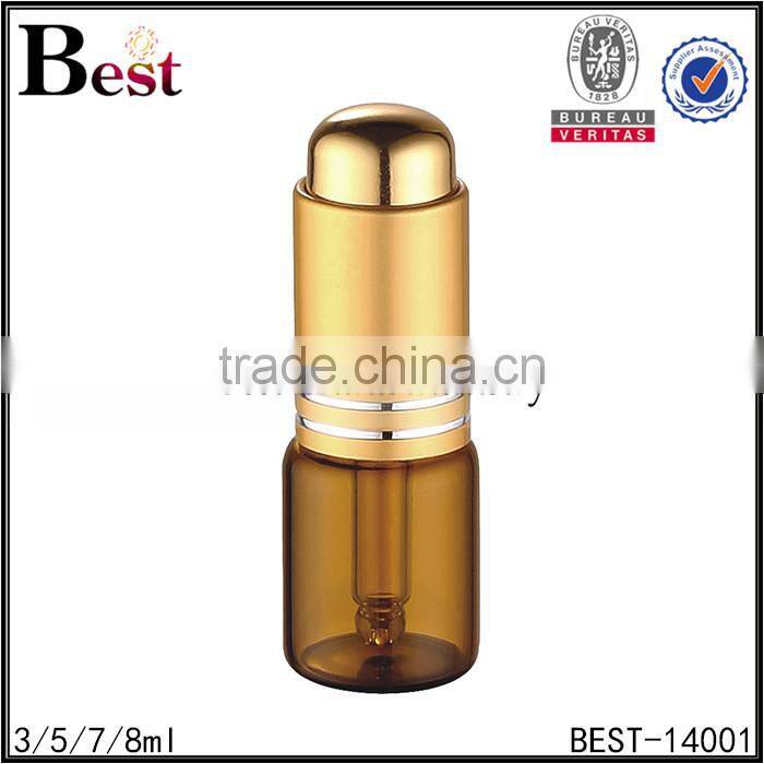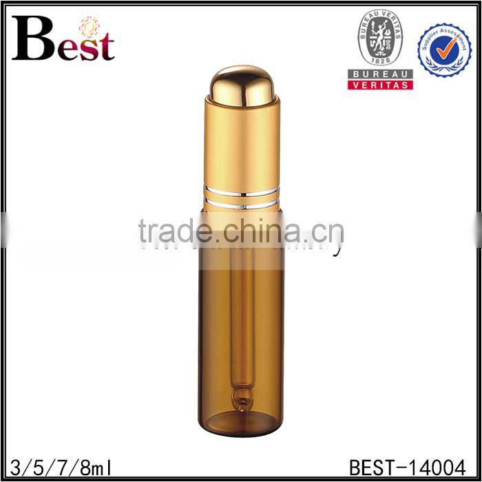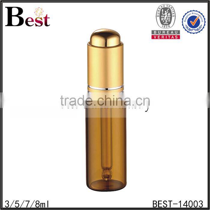best selling 3ml 5ml 7ml 8ml cosmetic essential oil bottle perfume glass amber golden aluminum pump glass perfume bottle china