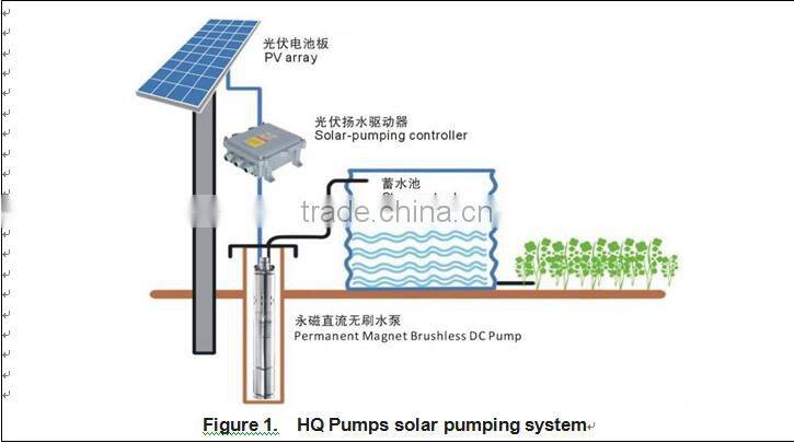 HQ solar pumping system serves to provide water in remote applications where electrical grid power is either unreliable or unavailable. HQ solar pump controller can direct use the DC power from PV array, and drive the brushless DC pumps. In sunny days, the pumping system can continuously pump water. The system without batteries and other energy storage devices, it is recommended to take water pumped to a reservoir for later use and water sources are those natural or special such as river, lake, well or waterway, etc. A float switch can be installed in the water tower to control the pump operation. And install a low-level probe in well to detect the well water so that when the water shortage pump is stopped. Figure 1 shows a typical diagram of the pumping system. The major parts and components in the system.