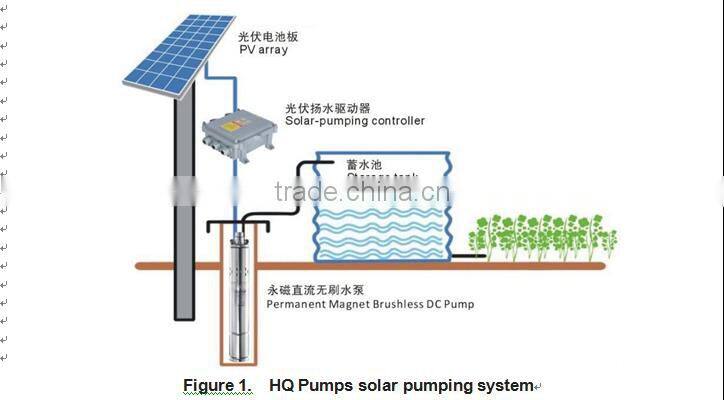 HQ solar pumping system serves to provide water in remote applications where electrical grid power is either unreliable or unavailable. HQ solar pump controller can direct use the DC power from PV array, and drive the brushless DC pumps. In sunny days, the pumping system can continuously pump water. The system without batteries and other energy storage devices, it is recommended to take water pumped to a reservoir for later use and water sources are those natural or special such as river, lake, well or waterway, etc. A float switch can be installed in the water tower to control the pump operation. And install a low-level probe in well to detect the well water so that when the water shortage pump is stopped. Figure 1 shows a typical diagram of the pumping system. The major parts and components in the system.