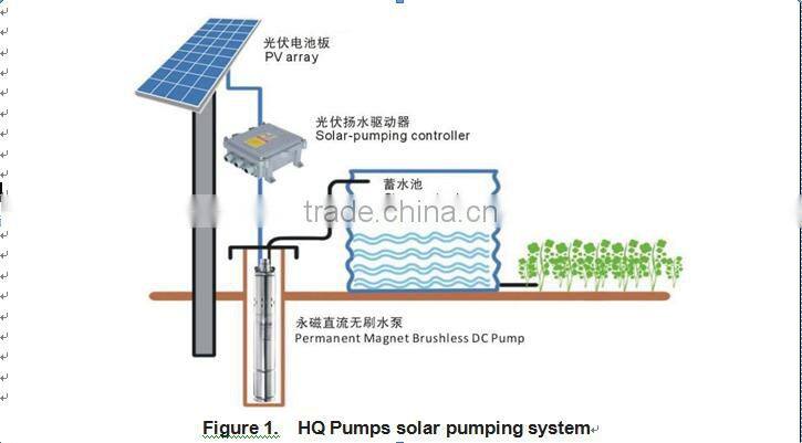 HQ solar pumping system serves to provide water in remote applications where electrical grid power is either unreliable or unavailable. HQ solar pump controller can direct use the DC power from PV array, and drive the brushless DC pumps. In sunny days, the pumping system can continuously pump water. The system without batteries and other energy storage devices, it is recommended to take water pumped to a reservoir for later use and water sources are those natural or special such as river, lake, well or waterway, etc. A float switch can be installed in the water tower to control the pump operation. And install a low-level probe in well to detect the well water so that when the water shortage pump is stopped. Figure 1 shows a typical diagram of the pumping system. The major parts and components in the system.