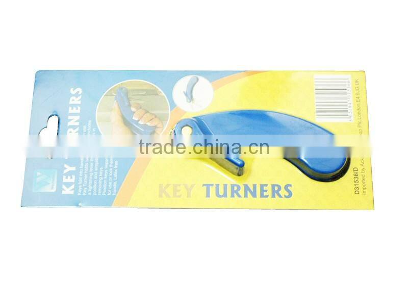 Large curved heavy duty plastic handle. Ideal for arthritis sufferers. Provides comfortable grip and leverage while turning keys. Holds 3 keys. Keys fold into the handle when not in used. Easy to attach keys designed to remove the need to twist the wrist or pinch the fingers when turning a key
