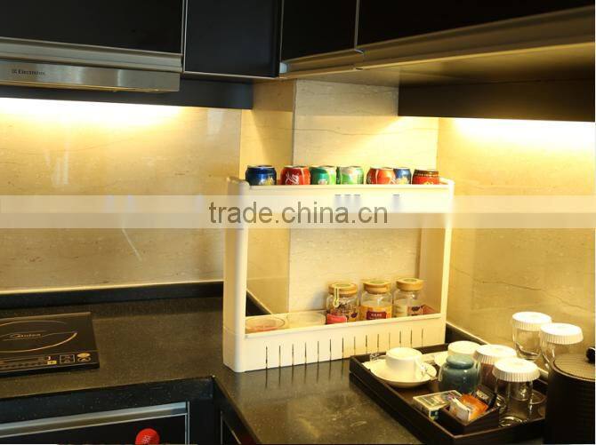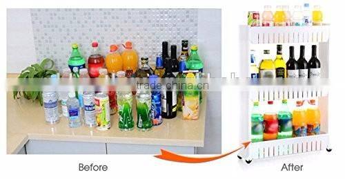 - This slim pull out 3-tier cupboard on wheels fits perfectly between fridge and counter.