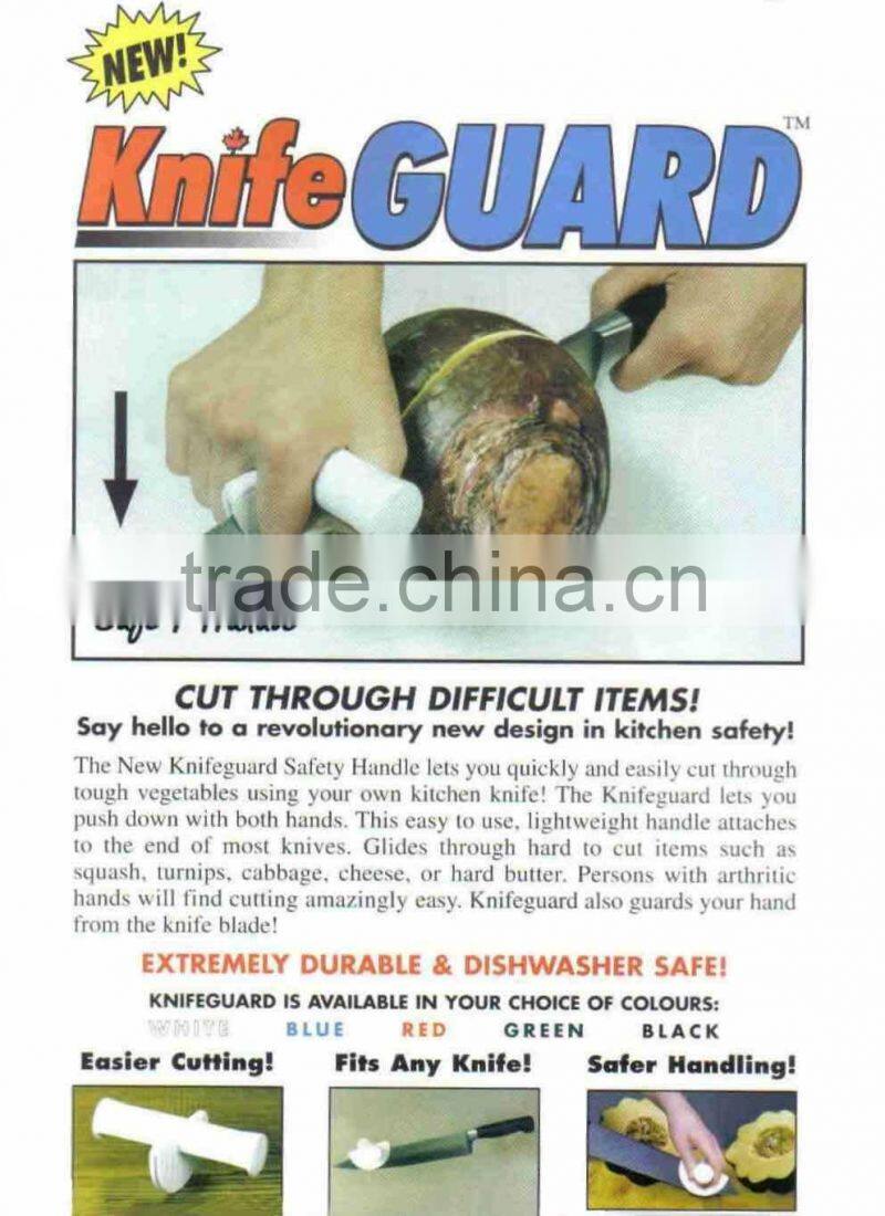 The Knife Guard Safety Handle guards your hand from the knife. This easy to use, lightweight handle attaches to the end of most knifes, providing a second handle to push down on. It guides through hard to cut items such as turnips, squash and cheese with greater ease and stability. Persons with arthritic hands will find cutting amazingly easy.