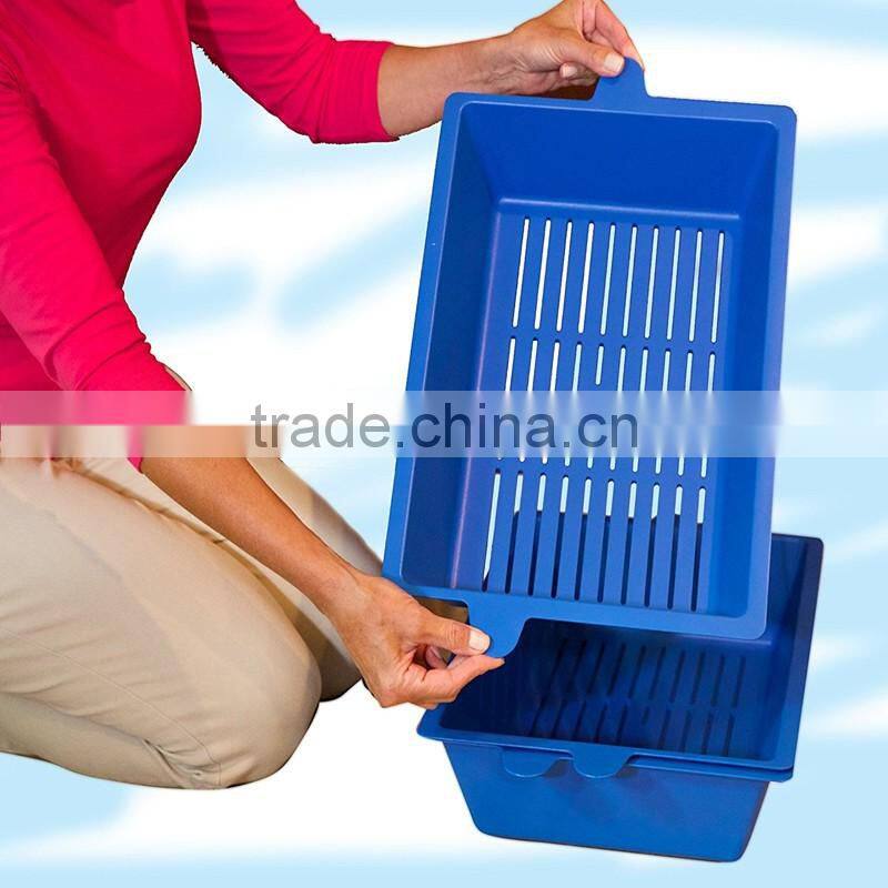 It consists of 3 identical trays that interlock when tuned 180 degrees quickly trapping any clean litter and disposing the waste behind. With a quick lift & sift of the first, top tray the soiled waste is disposed leaving the bottom trays clean. Once the trays are emptied, you reset them in place, just that simple!