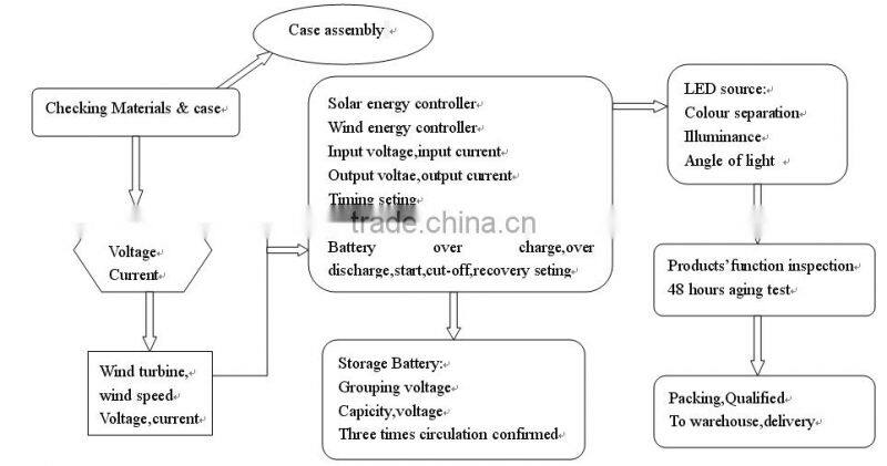 The system is mainly composed of solar panel,wind turbine, light source, controller and battery all in one lamp,it is defferent from the design of old solar street light with outer controller parts. In daytime, when there is sunshine or winds the solar panel and wind turbine can convert the solar energy and store it in the battery.