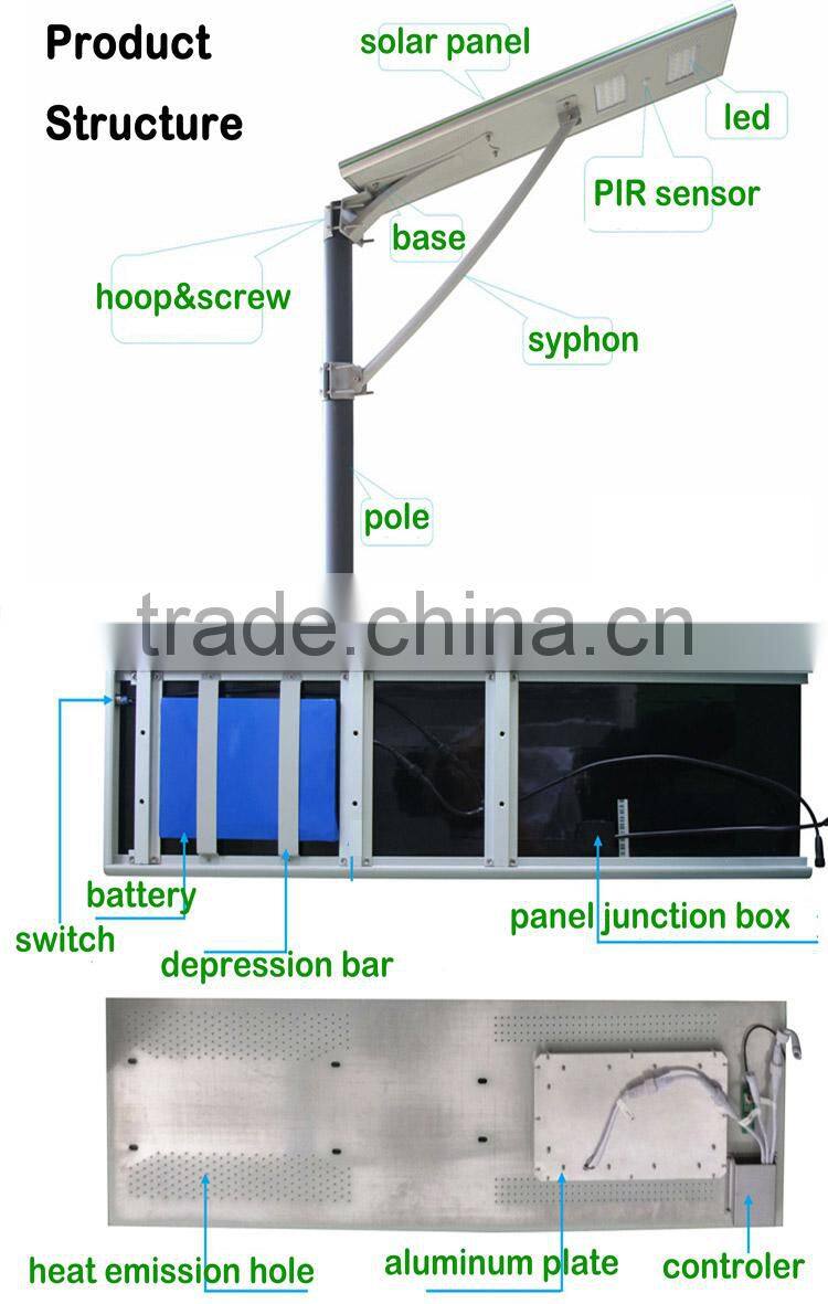 The system is mainly composed of solar panel, light source, controller and battery all in one lamp,it is defferent from the design of old solar street light with outer controller parts. In daytime, when there is sunshine,the solar panel can convert the solar energy and store it in the battery.