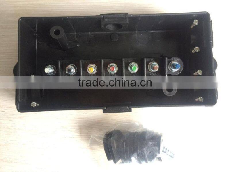 6 or 7 - pole junction box, the 7 - Pole Junction Box provides a fast, simplified way of connecting wires from the trailer cord to the trailer wiring.Clean up your wiring while keeping everything organized and accessible. It is an excellent area for trouble shooting by offering a single connection point. The junction box is made of heavy plastic and includes hardware, 4 closed and 4 open rubber fitted grommets making it weather proof andcorrosion resistant.with 7 color coded studs. Works with any trailer that uses 7-pin (or less) wiring