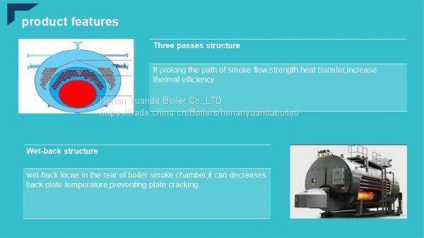 WNS series gas fired steam boiler is the resource saving and environment protecting boiler ,It is a three passes cylinder type boiler,compact structure,good-looking apparence.it adopt international latest technology for big volume combustion room design, and use brand burner machine.High efficient heat transfer and low exhaust gas temperature.1. Adopting the latest technology, it is designed with a combustion chamber with large volume. It is equipped with a world-known burner, making the combustion more sufficient and ensuring higher efficiency and lower failure rate.