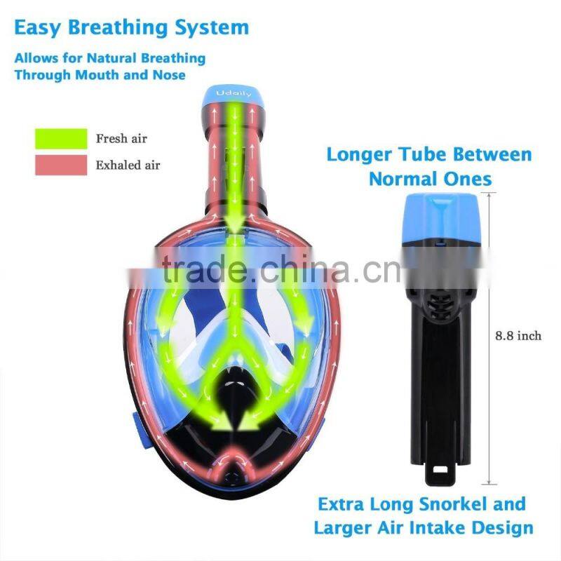 WIDE ANGLE VIEW: Udaily Full Face Snorkel Mask provides a 180 degrees viewing area for exploring the Incredible Underwater World. Shatterproof window for added safety, guarantees that you will see everything clearly. With our Action Camera Mount you can easily attach your GoPro camera or other integrated camera to capture your wonderful adventure.