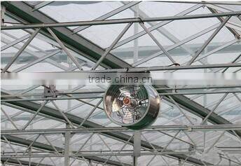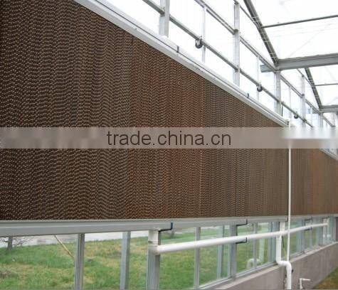 Cooling pad Cooling fan The air inside the greenhouse is drawn out by the exhaust fan, resulting in negative pressure inside, so the dry and hot air will be pulled in the greenhouse by the pressure through the wet cooling pad, and then it becomes cool after passing the cooling pad. The cool air then absorbs the heat inside greenhouse and drawn out by the fan, the temperature is reduced at last.