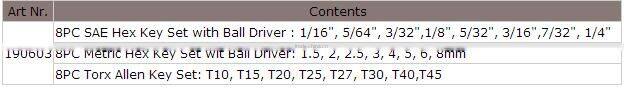 Description: Allen key is a tool of hexagonal cross-section used to drive bolts and screws that have a hexagonal socket in the head (internal-wrenching hexagon drive). this allen key consists of 8 PC SAE, 8 PC Metirc and 8PC Torx Key wrench, all are made of chrome vanadium steel with satin finish. Good heat-treated and torque for high quality and long time use.