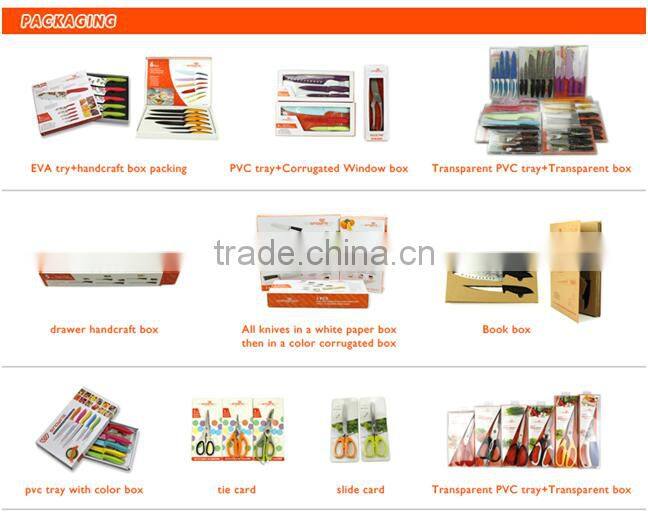 | Packing details | Each knife with a paper sleeve on the blade and then in a polybag. Each set in a white box. 40set/CTN, CTN size: 40x33x40cm. |