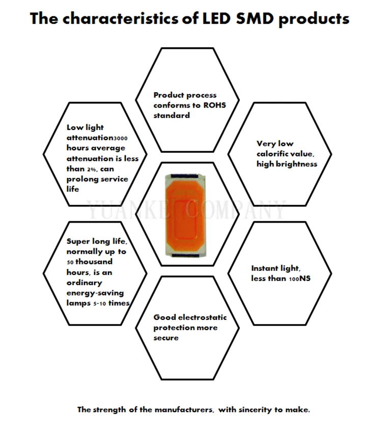 The company SMD SMT LED series products adopt imported chips with high luminous efficiency, narrow spectrum, good monochromaticity, high color rendering, green environmental protection, precision constant current, life 50000 hours, low attenuation, high brightness, low attenuation, small energy consumption, long service life. Antistatic ability, high brightness, good color consistency; Low light, long life, etc.