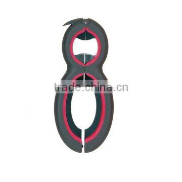The unique opener opens 6 different seals and lids. It has a hidden blade that zips open bags and a clamp that opens safety seals. For beverages use the pull tab opener, pops off a bottle cap, or opens screw caps. It can also be used for opening jar lids. Gray with red accents, it is durable, has a comfort grip and is dishwasher safe.