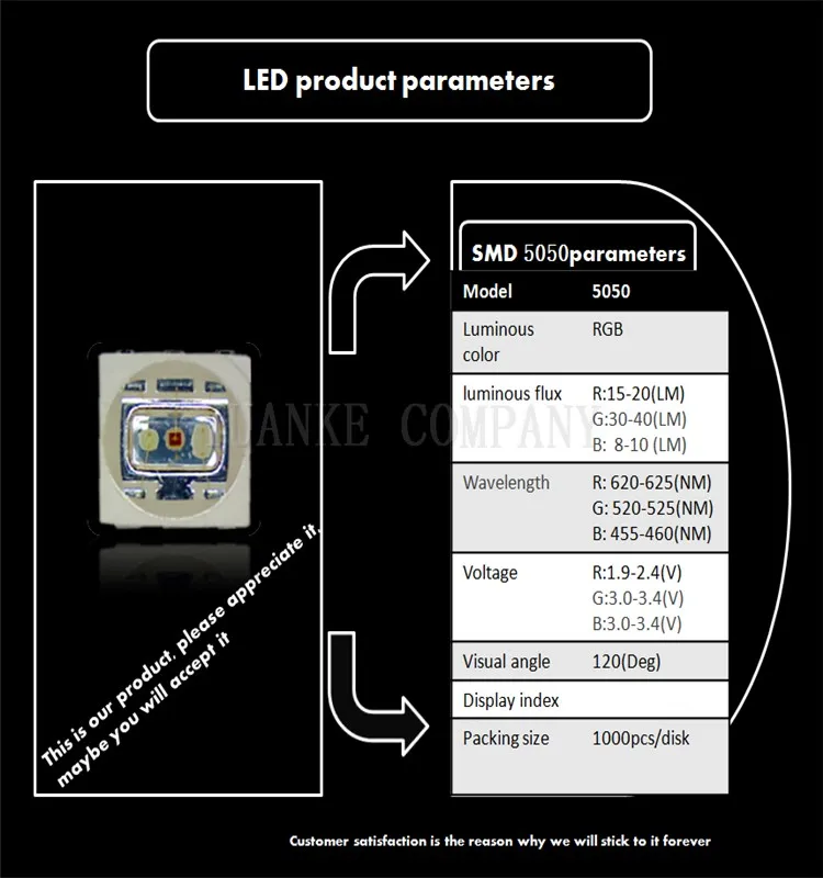 | 5050 | White | 6000-6500K | 22-24LM | 2.9-3.4V | 120 | - | 1000pcs/Roll |