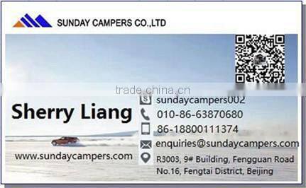 Sunday Campers Co.,Ltd established in 2009,who mainly deal with roof top tent,awning tent, swag, trailer tent, and other camping tent.Through many years of development we already develop into the leader of roof top tent in China. Our factory is located in Hebei Province, and our sales teams in Beijing.