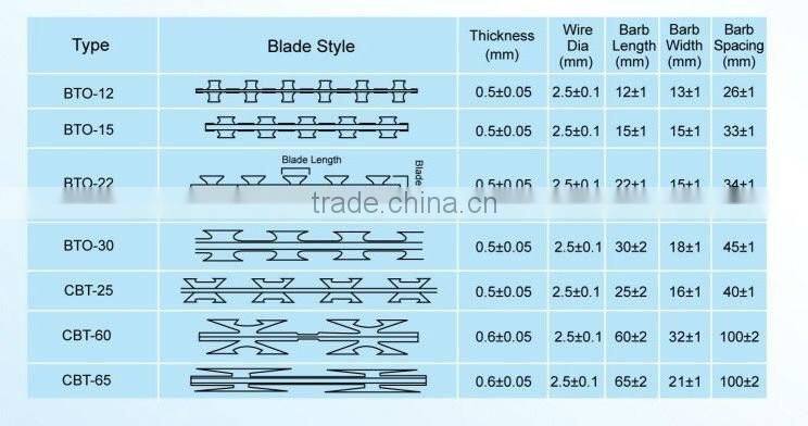 type Razor wire,concertina coils, crossed type and flat type according to the installation models .