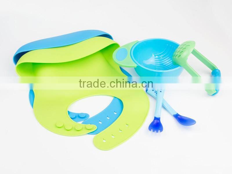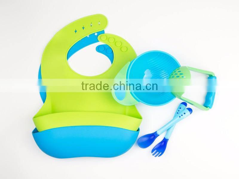 Home > Products > Silicon Baby Care goods > Baby Dinner Set: Suction Bowl + Food Masher + Spoon + Bib, Multiple Color, Customized Packaging, Private Label