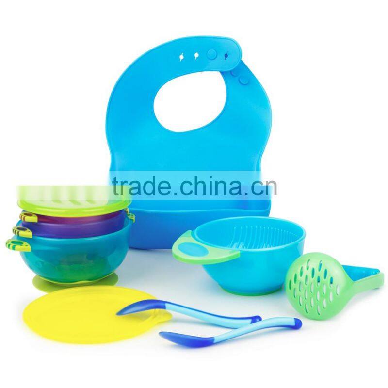 Baby Feeding Accessories Bundle: Suction Bowl + Food Masher + Spoon + Bib, Multiple Color, Private Label