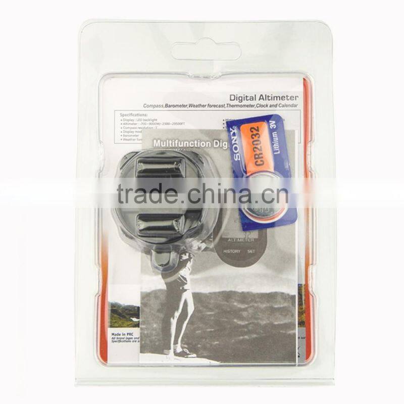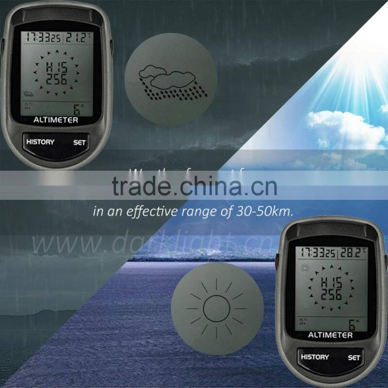 Digital Altimeter, with digital barometer, digital compass, weather forecast, clock, calendar, and thermometer. The device is based on the technology of electronic bearing sensor and barometric sensor.
