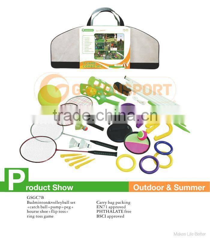 | Game include | badminton&volleyball set+catch ball+pump +peg+horse shoe+flip toss +ring toss game |
