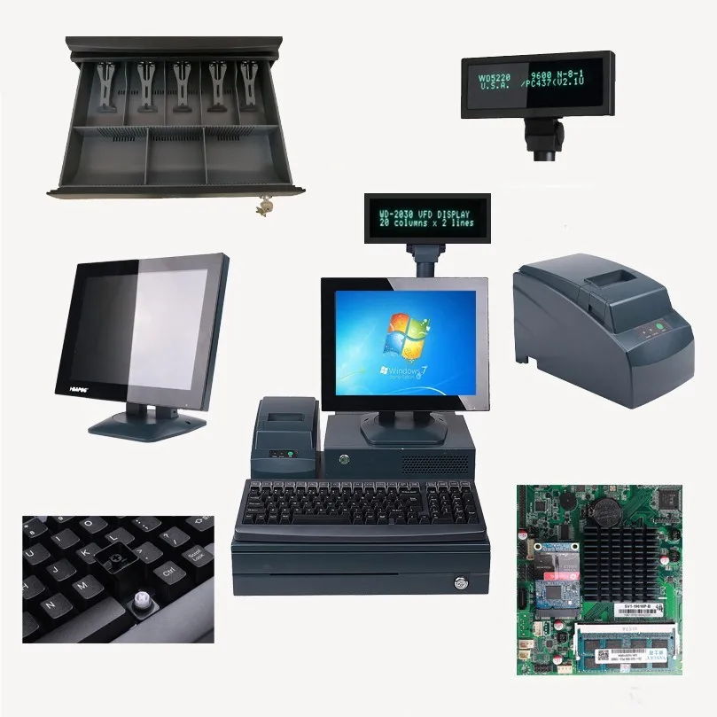 Pos system, touch screen pos system, thermal printer, cash drawer and barcode scanner.