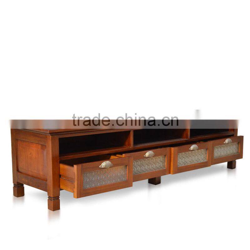 Side Board, Modern art, just as seen in this picture, very pretty in the eye, and is suitable to place it in the family room or in your working room, this side board could be as a complement to the placement of hi-fi equipment and TV stand . Side board is also equipped 4 pieces of drawers and shelves, as seen in the appearance of this image, Front part of the Drawers combination with glass classic models, to display a more elegant impression. All the wood made from solid teak wood, stained with dark brown teak color.