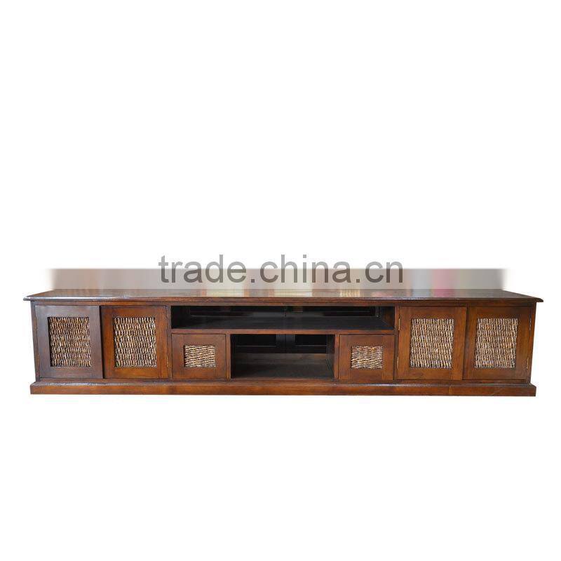 Handle Drawers On this side board very nice made from brass with frog design. Suitable to use as your TV Stand or Hi Fi equipment On Your Living room, Made from Solid teak wood and Coloring with teak brown. On front side of this console there are 4 Doors combination with waterhyacinth webbing as per this picture.