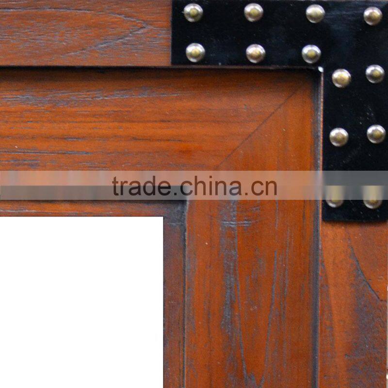 This mirror is in order by one of our clients from Surabaya, to complete the needs of a cafe with vintage nuance, Here we make in accordance with the request of the client, to fulfill his wishes. This mirror frame we made from teak wood, and in finishing with rustic method, in order to keep showing the element of vintage, in order to be in harmony with his placement. This frame we combine with a black metal layer and we embed it in every corner of the frame. To display an elegant impression in accordance with the theme of the cafe.