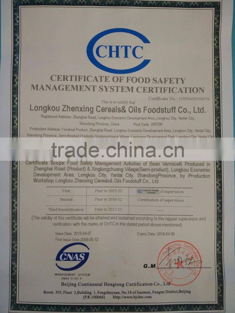 6:Natural Longkou bean Vermicelli Quality/Safety Certifications:ISO9001, ISO14001, HACCP, No irradiation, No GMO, SO2<15ppm.