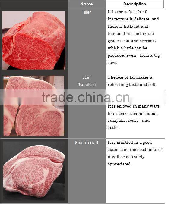 | *There is the countrywhere I cannotexport it to. What is JAPANESE BLACK?Japanese Black Cattle is the best of the world's beef that Japan is proud of . The characteristic of Japanese Black Cattle (JAPANESE BLACK) is marbled meat . There are fats called "sashi" among the red meat, which looks like frosted. The "sashi" makes mouth feeling of the beef very soft. The flavor of "sashi" spreads in mouth, making the beef more delicious, because people feel good taste of the fat. Almost all of representative famous brand of Japanese beef are JAPANESE BLACK. The sweetness which is like melted on a tongue is delicious and makes people unbearable. It is used in many prestigious restaurants. It is loved by overseas celebrities because its value is also high globally. |