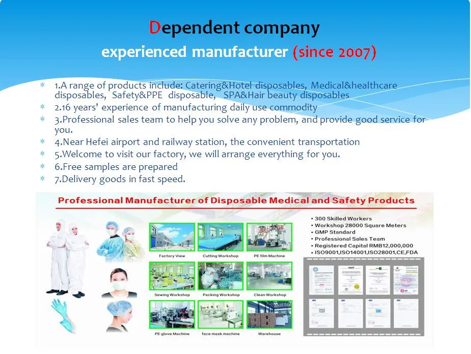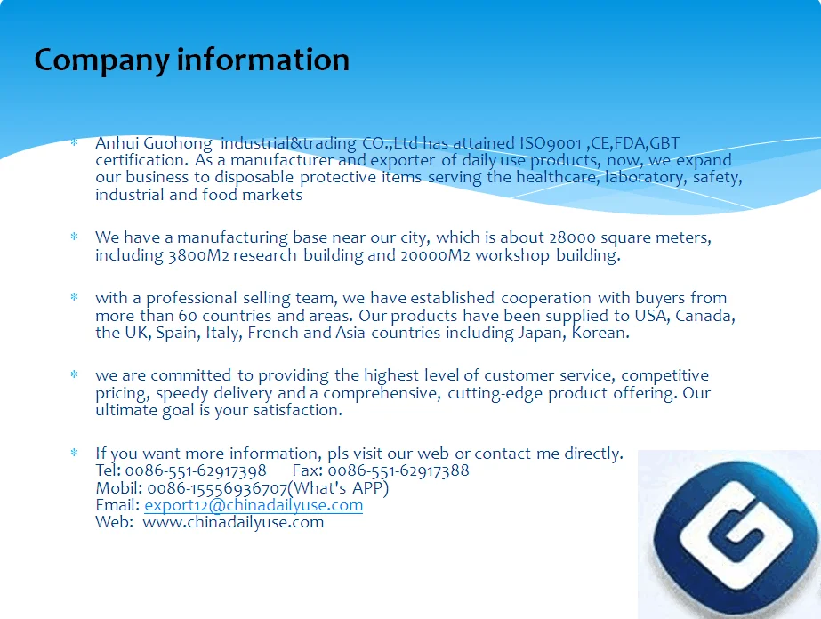 Anhui Guohong Industrial & Trading Co., Ltd. has attained ISO9001 certification. We are a professional supplier of restaurant & hotel supplies, with 15 years' experience of manufacturing disposable clothing and paper, such as chef hats, bouffant caps, sandwich paper, face masks, shoe and boot covers, over sleeves, gloves, aprons and other related products. We have several subsidiaries which can provide a wide range of disposable products for safety and hygiene industries. Our Products We have the ability to source almost any products according to your manufacturing and design specifications. We can also duplicate your existing package design, or create a package design which will be unique for your brand products. We are committed to offering products of the highest quality, which can meet our stringent manufacturing standards and are made in the hygienically controlled production environment. We promise to provide an easy and direct buying for you! Our Quality We are aiming at achieving recognition in the world market. Recently, we have successfully expanded our marketing network to many countries and regions, such as the Middle East, the United States, the United Kingdom, Germany, Ireland, France, Italy, Japan, and Singapore. We attribute this significant expansion to meeting the growing needs of our customers, through production of superior quality apparel, and by adhering to the strictest quality standards for our customers. Our Advantage We look forward to providing you with the highest quality products. With strong manufacturing foundation and powerful logistics resources, we can satisfy our customers' fulfillment needs promptly and efficiently. Our Promise to You: We promise you High Quality, Superior Service, and of course, Competitive Price. We invite you to take advantage of our experience and expertise, and see how our stringent quality controls can work for you! We sincerely wish to cooperate with you. Please contact us at your convenience!