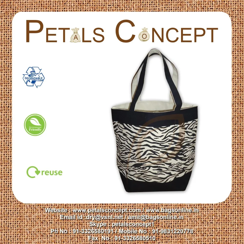 Our beautiful bags come in different shape , style , Size & design with variety of print like floral design , Animal texture print , landscape print , logo , Nature print , Stripe print etc with various option of Handle like Jute , cotton , web handle, Wooden handle ,Cane handle, Leather handle , Padded Rope handle , Bamboo handle etc & can be customize according to requirement.