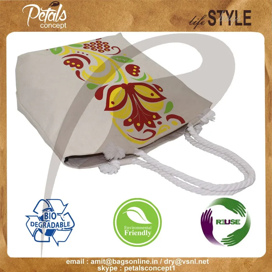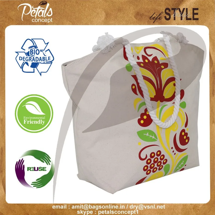 Our beautiful bags come in different shape , style , Size & design with variety of print like floral design , Animal texture print , landscape print , logo , Nature print , Stripe print etc with various option of Handle like Jute , cotton , web handle, Wooden handle ,Cane handle, Leather handle , Padded Rope handle , Bamboo handle etc & can be customize according to requirement.