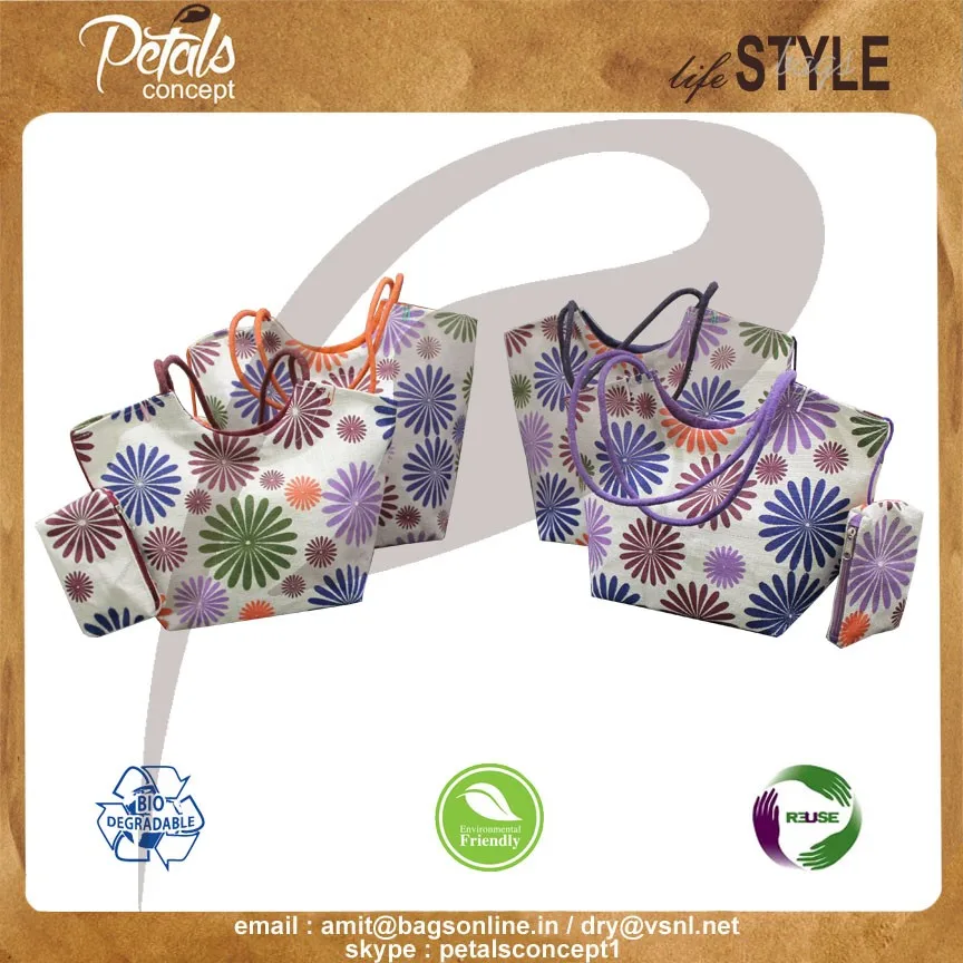 Our beautiful bags come in different shape , style , Size & design with variety of print like floral design , Animal texture print , landscape print , logo , Nature print , Stripe print etc with various option of Handle like Jute , cotton , web handle, Wooden handle ,Cane handle, Leather handle , Padded Rope handle , Bamboo handle etc & can be customize according to requirement.