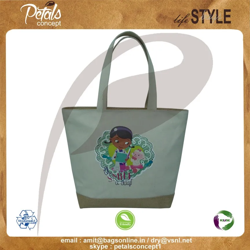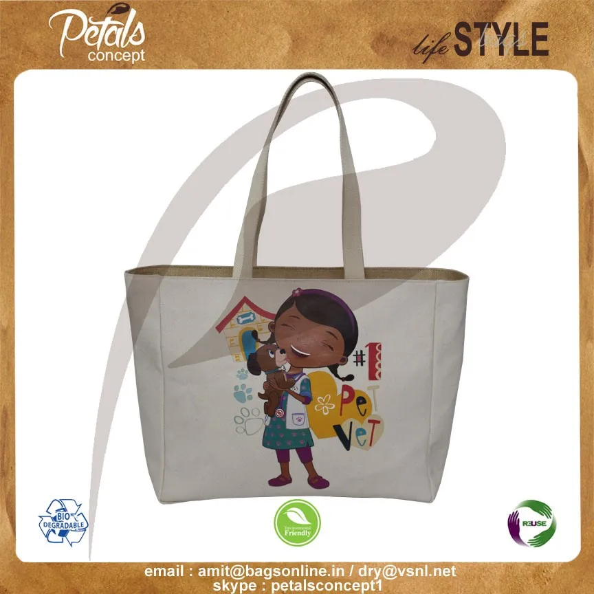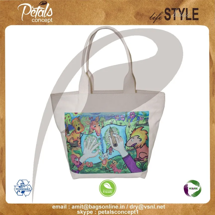 Our beautiful bags come in different shape , style , Size & design with variety of print like floral design , Animal texture print , landscape print , logo , Nature print , Stripe print etc with various option of Handle like Jute , cotton , web handle, Wooden handle ,Cane handle, Leather handle , Padded Rope handle , Bamboo handle etc & can be customize according to requirement.