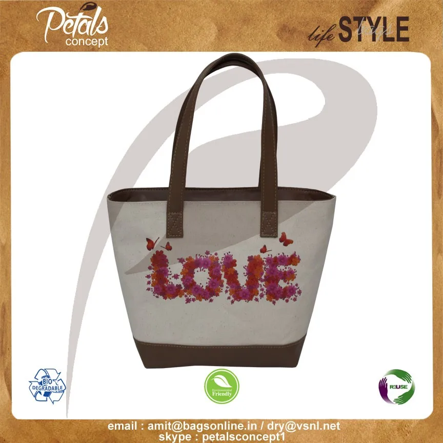 Our beautiful bags come in different shape , style , Size & design with variety of print like floral design , Animal texture print , landscape print , logo , Nature print , Stripe print etc with various option of Handle like Jute , cotton , web handle, Wooden handle ,Cane handle, Leather handle , Padded Rope handle , Bamboo handle etc & can be customize according to requirement.