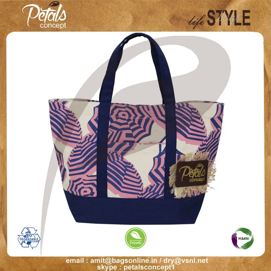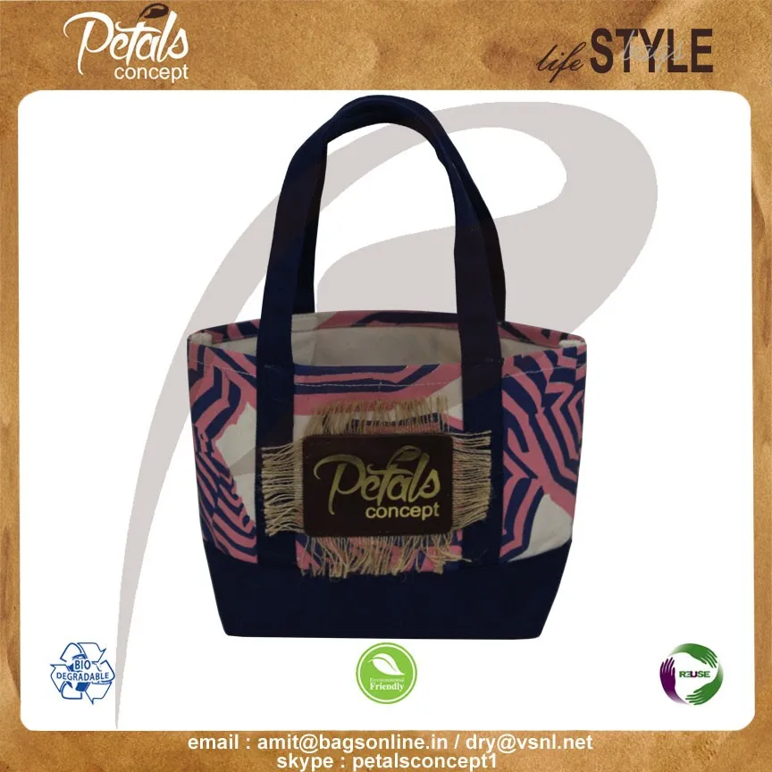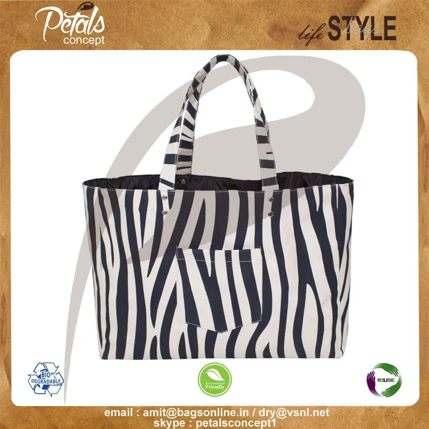 Our beautiful bags come in different shape , style , Size & design with variety of print like floral design , Animal texture print , landscape print , logo , Nature print , Stripe print etc with various option of Handle like Jute , cotton , web handle, Wooden handle ,Cane handle, Leather handle , Padded Rope handle , Bamboo handle etc & can be customize according to requirement.