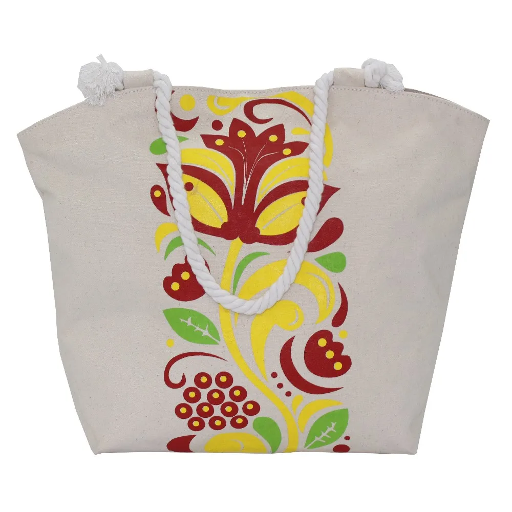 12 oz Natural Canvas Floral Print Tote Bag With Hanging Zip Pocket & With Twisted Rope Handle